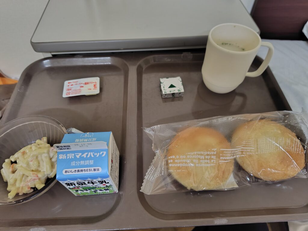 入院中の食事については、4年前より少し美味しくなった気がします。しかし、朝食は少なめです。パンとご飯が交互で、パンの日は食パンかおぼろパン、ミルクにあと一品、ご飯の日はご飯、味噌汁にふりかけか海苔の佃煮、煮物か漬物って感じです。食パンの日は、マーガリンとジャムが付きますがおぼろパンの日はありません。私は自腹で購入したマーガリンとジャムが一緒になったやつ使ってます。それにチーズとインスタントのスープをプラスしてました。が、入院以来、朝の血圧が高く原因を探ったところ、どうも入院食3食の塩分合計が高いようです。大体6〜7グラムあり、スープや味噌汁を足すと、推奨されている7.5グラムを確実に超えてきます。ってことで今はコーヒーや紅茶に変えています。4年前より美味しく感じたのはもしかしたら塩分のせいかもしれません。